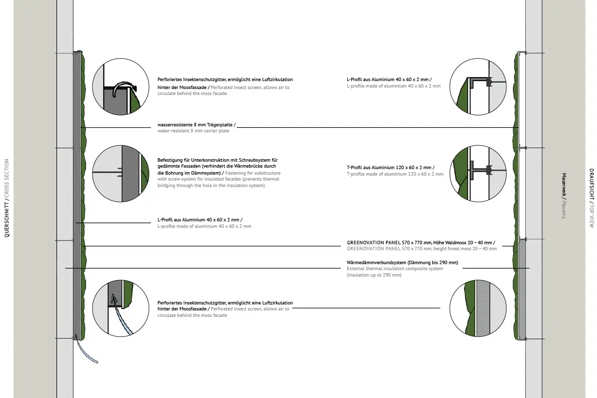 Die Klimafassade hat eine Garantie von 50 Jahren auf die Trägerplatte und 6 Jahre auf das Moos selbst. In der Praxis erwarten wir eine Lebensdauer von über 25 Jahren ohne jegliche Wartung.
