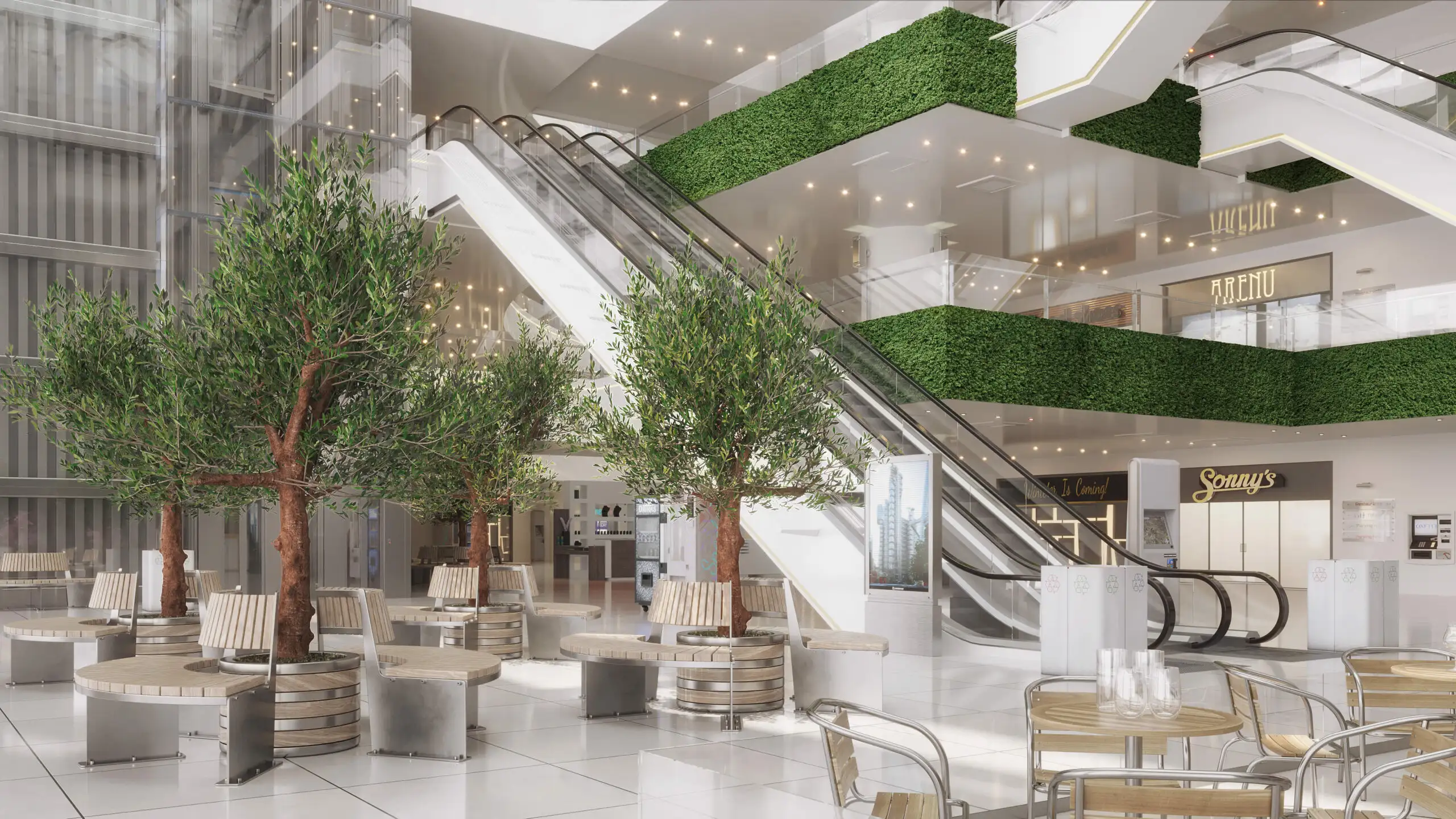 Innenräume im Biophilen Design mit künstlichen Bäumen, um eine beruhigende und entspannende Umgebung zu schaffen. Das optimale Produkt, um uns glücklicher und gesünder zu fühlen.